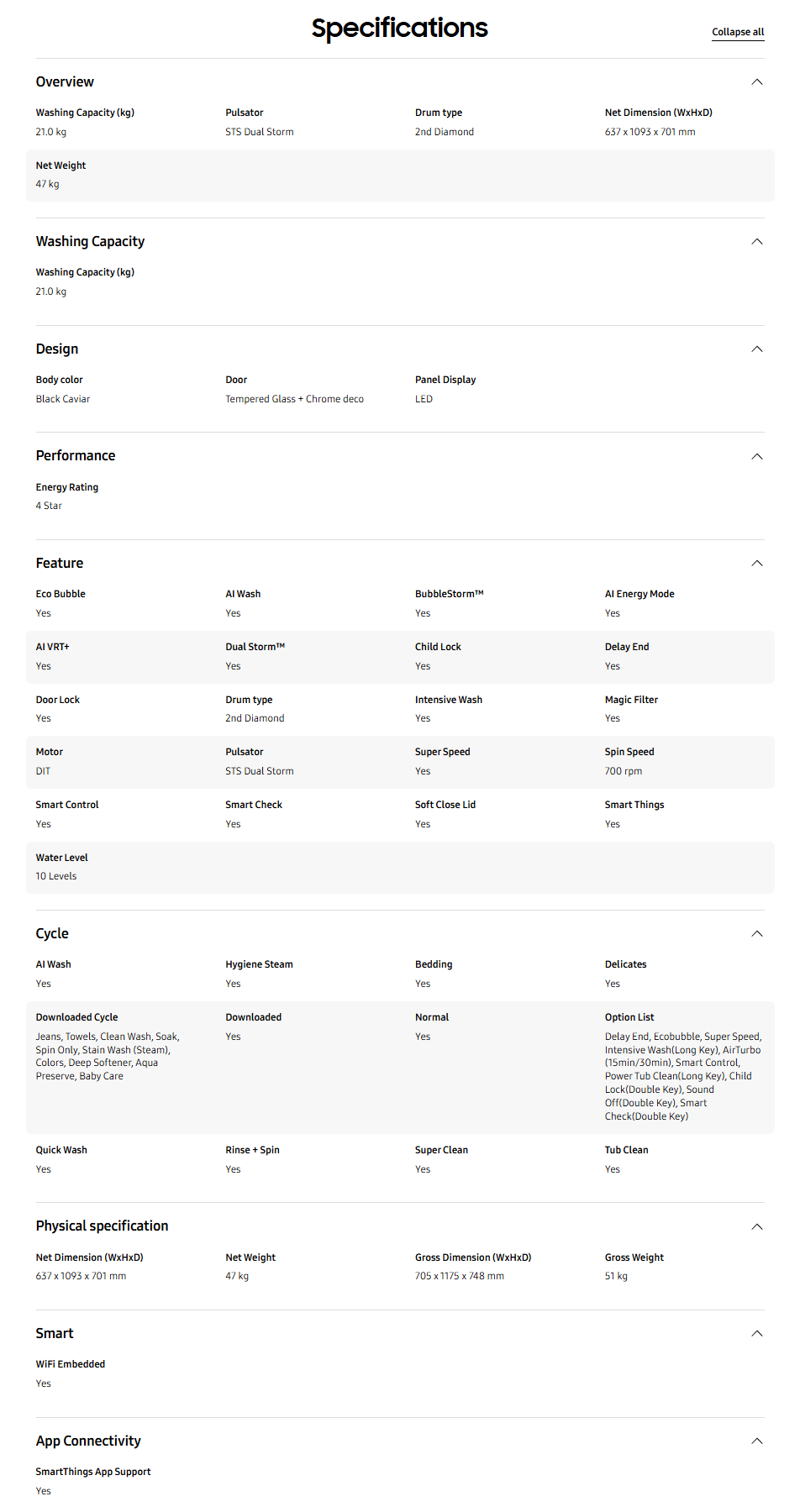 SAMSUNG 21KG BESPOKE AI INVERTER WASHING MACHINE WA80F21B9BFQ