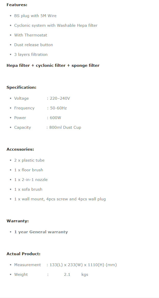 PENSONIC 600W WIRED STICK VACUUM PVC-1005H