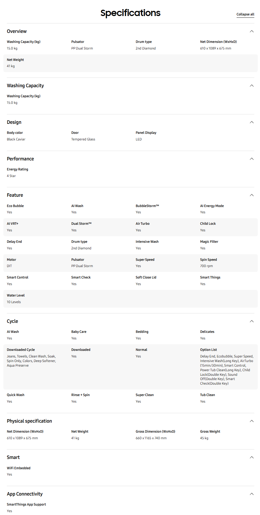 SAMSUNG 15KG BESPOKE AI INVERTER WASHING MACHINE WA80F15S5BFQ