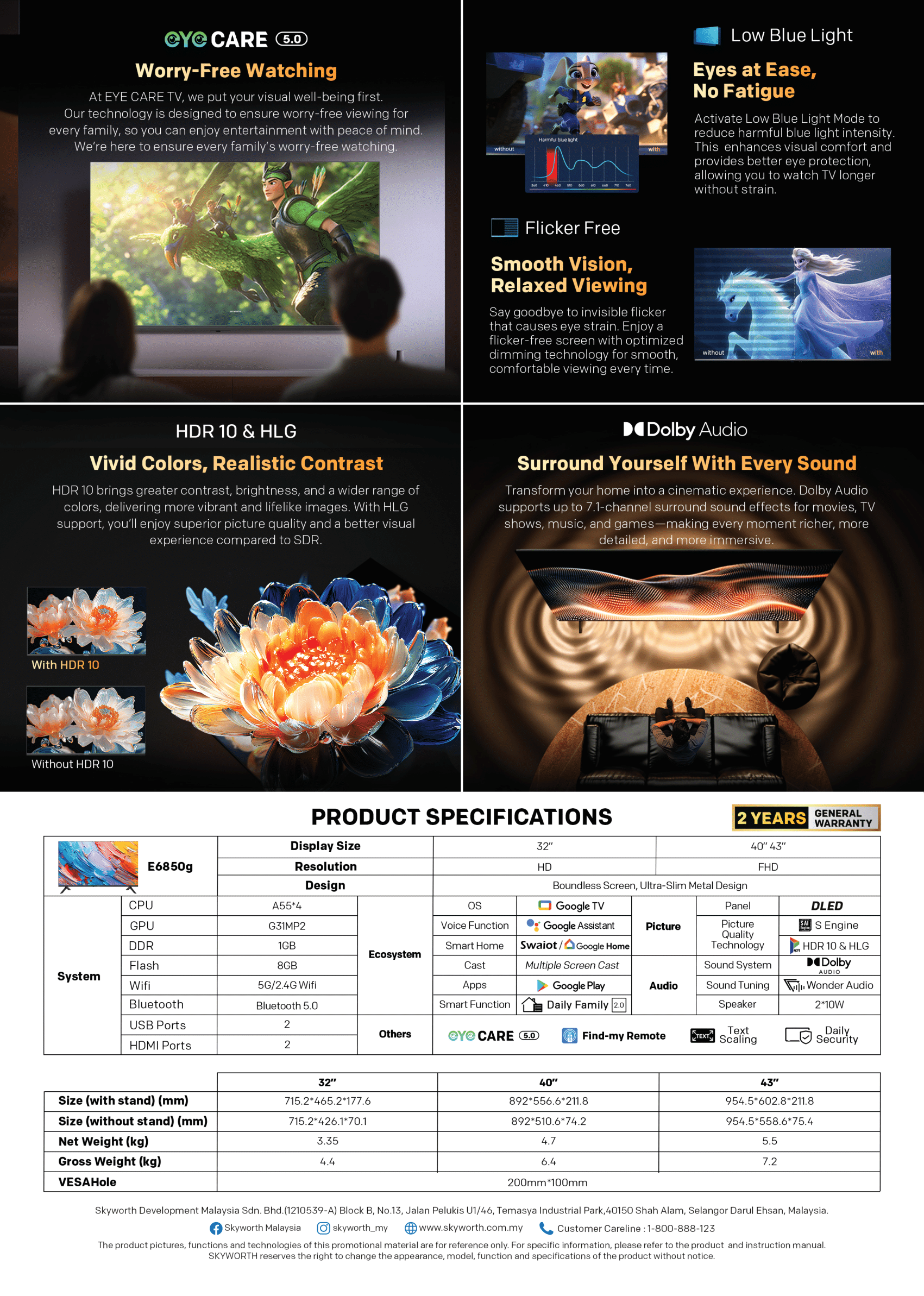 SKYWORTH 43'' FULL HD GOOGLE LED TV 43E6850G